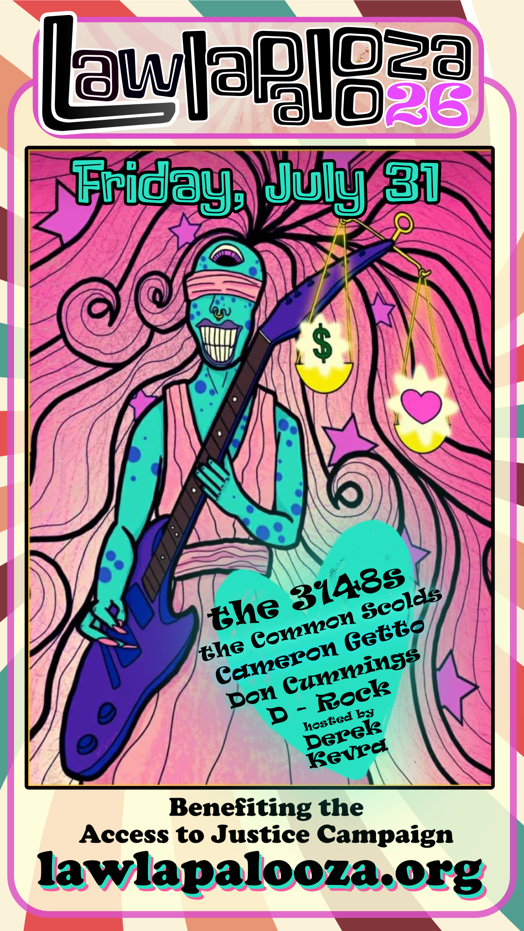 Lawlapalooza is back on Friday, July 31, 2026 at The Magic Bag in Ferndale for a night of live music put on by lawyers, friends, and local musicians who care about doing something useful with a stage and a crowd!